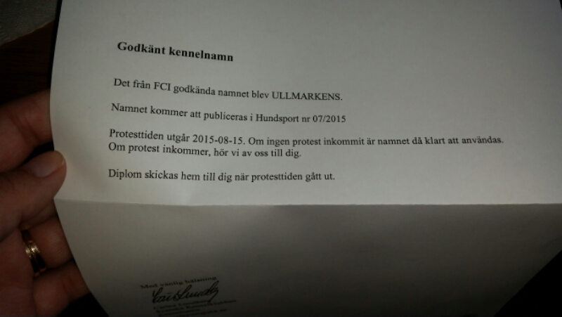 Nu är kennelnamnet även godkänt av FCI. Nu kommer det att publiceras i nästa hundsport i juli. Och när protesttiden är över så är det helt klart.