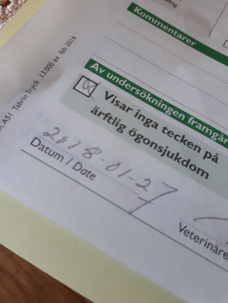 Om våra hundar ska gå i avel krävs det att de är hälsotestade. Vi har valt att göra lite fler tester än vad som egentligen krävs för att en pumi ska gå i avel. Mycket för att vi själva aktivt tränar och tävlar med våra hundar. Jilla har nyligen gått ur sitt löp så vi väljer att vänta till senare i vår innan vi röntgar henne. Men som alla gånger när jag ska hälsotesta en hund är jag supernervös. Jag vill ju såklart att hunden ska vara frisk på alla vis. Idag var det dags för Jilla att både ögonlysas och kolla patella. Båda undersöktes med resultatet utan anmärkning (UA). Jättekul! Tanken är att Jilla ska gå i avel om röntgenresultaten är ok. Så detta var en bra bit på väg.